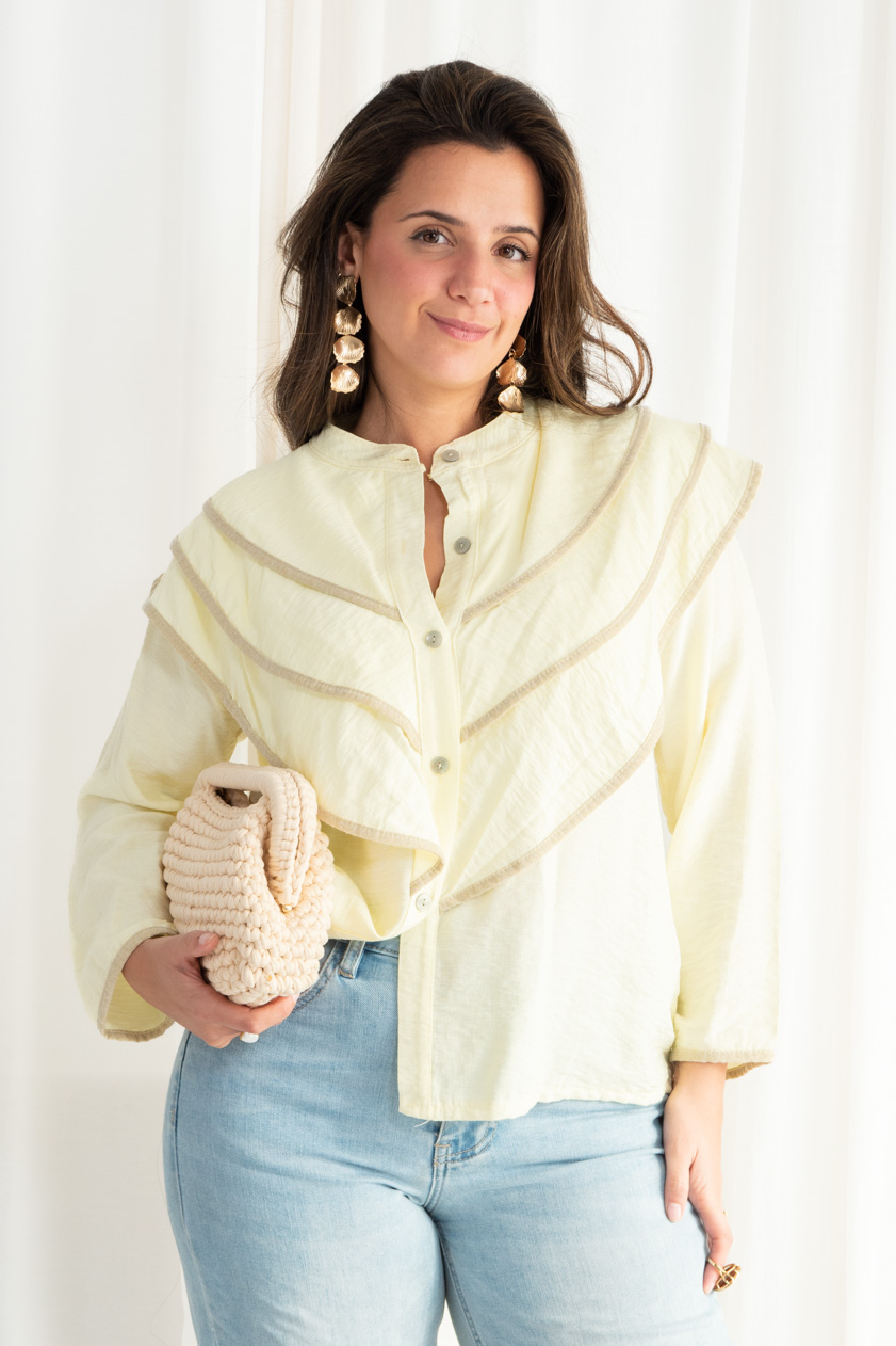 Blusa de manga larga con volantes. Atada con botones en la parte delantera y cuello tipo mao. Composición: 87% viscosa, 13% poliamida. Talla única, sirve para xs/s/m.