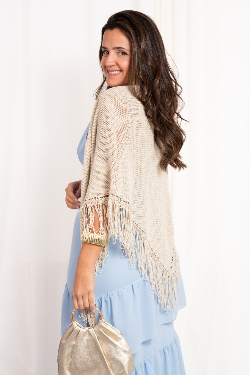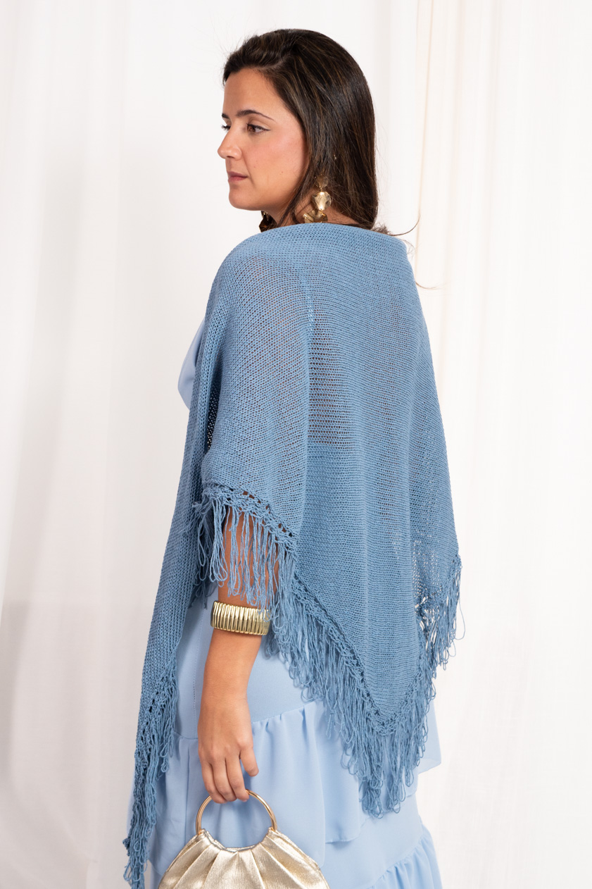 Chal de punto con detalle de calado e hilos en los extremos. Composición: 80% algodón, 20% acrílico.