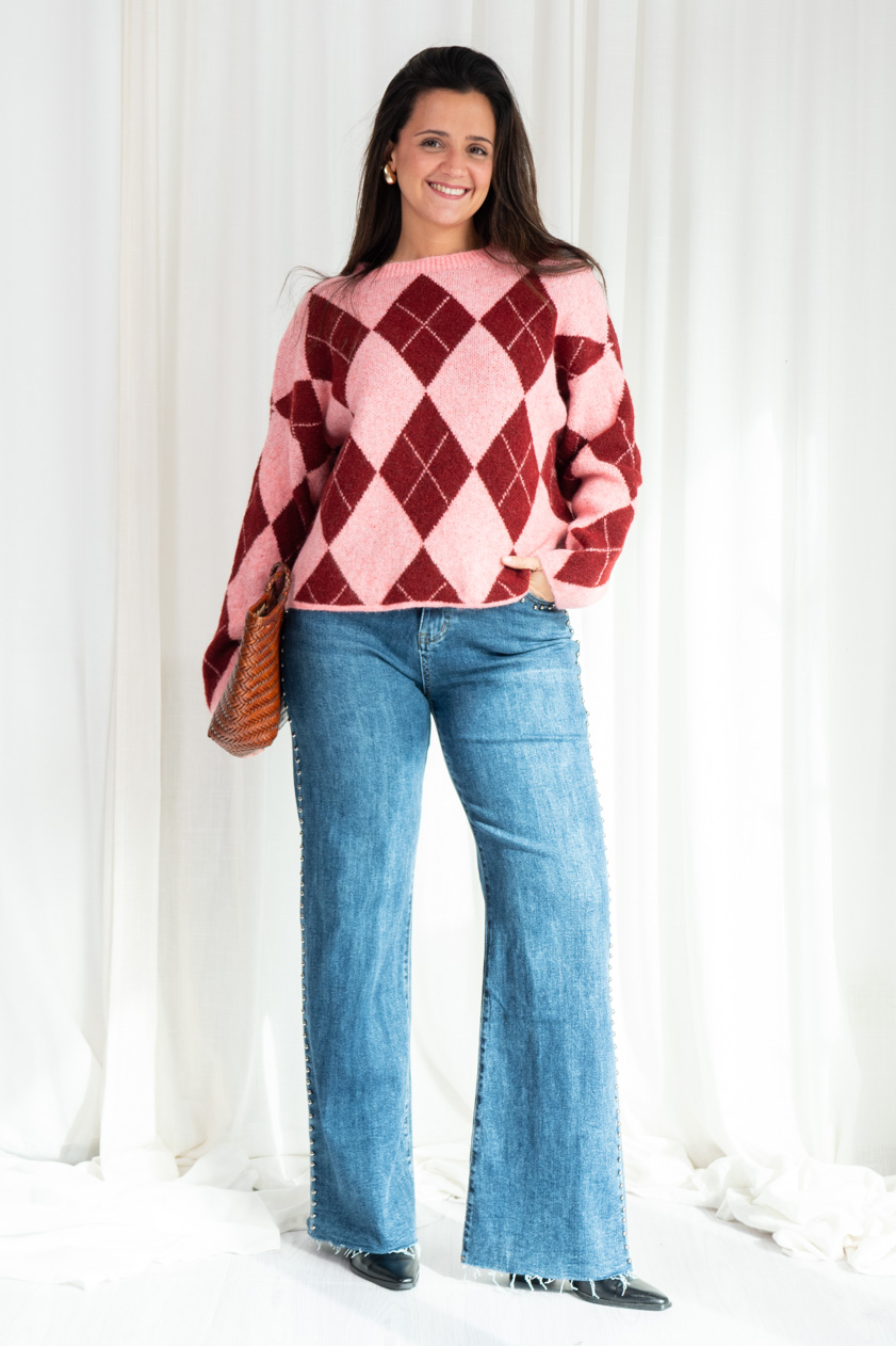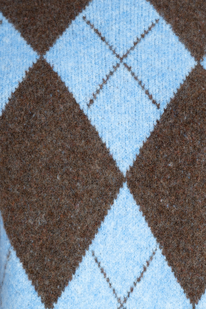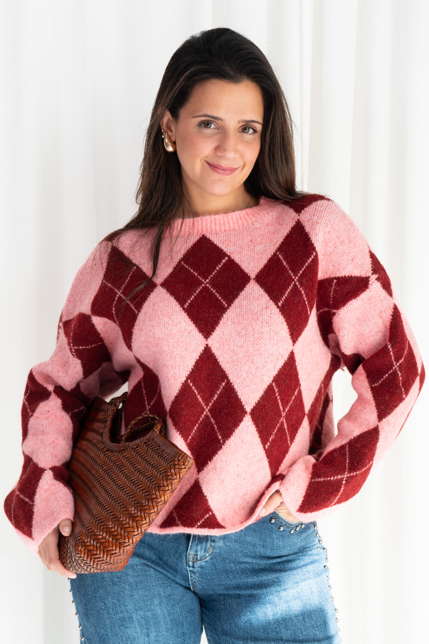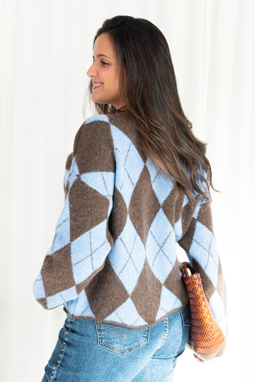 Jersey de rombos estilo inglés con cuello redondo acanalado. Talla única, sirve para S, M y L. Composición: 68% acrílico, 12% poliéster, 7% lana, 3% spandex.