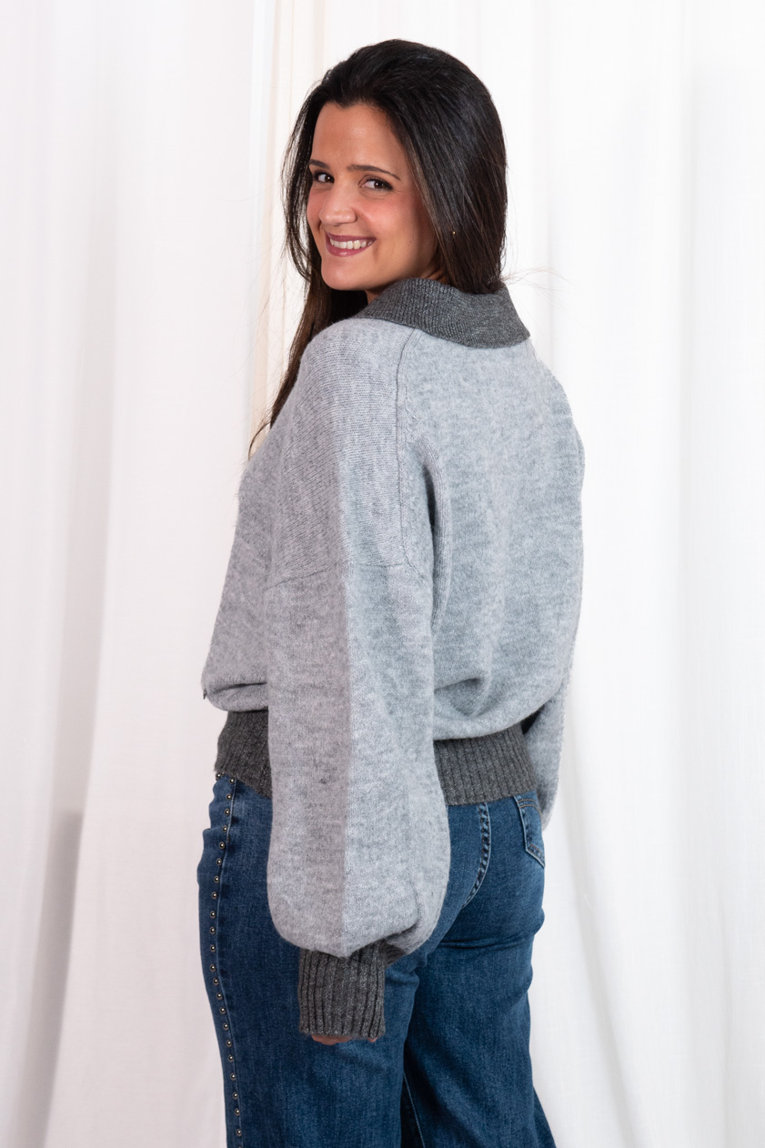 Jersey confeccionado al estilo polo, con cuello y botones en el escote. Puños y parte inferior acanalados. Composición: 68% acrílico, 12% poliéster, 11% nylon, 6% lana, 3% spandex.