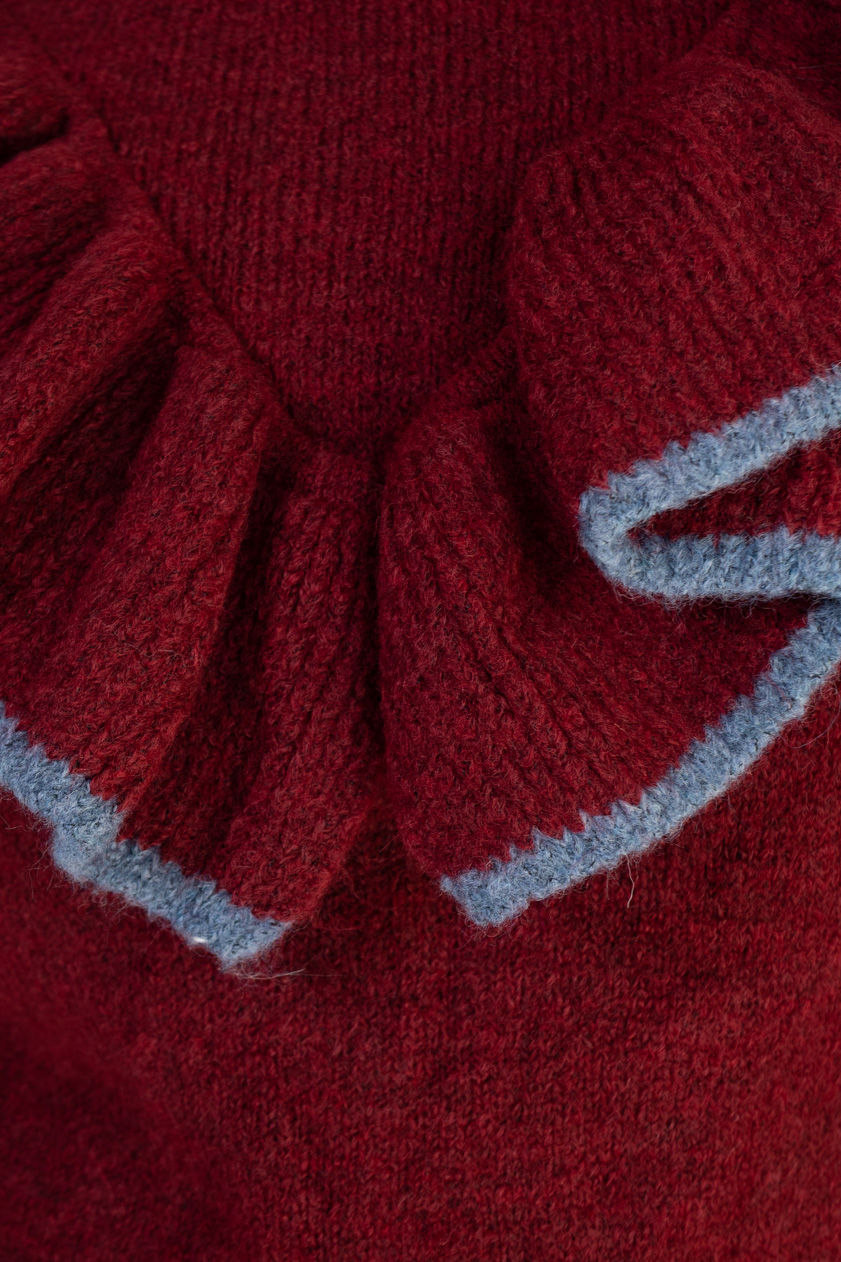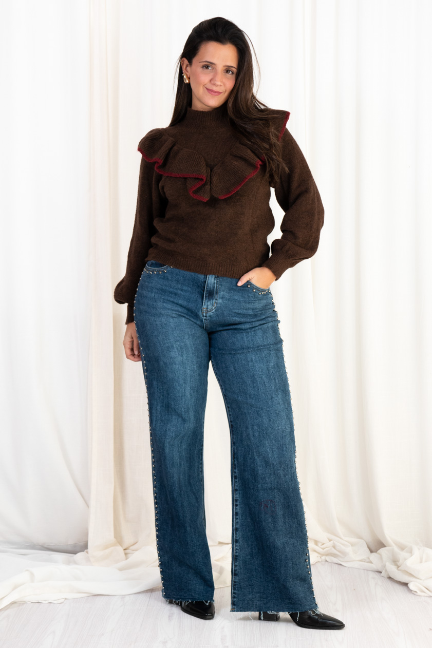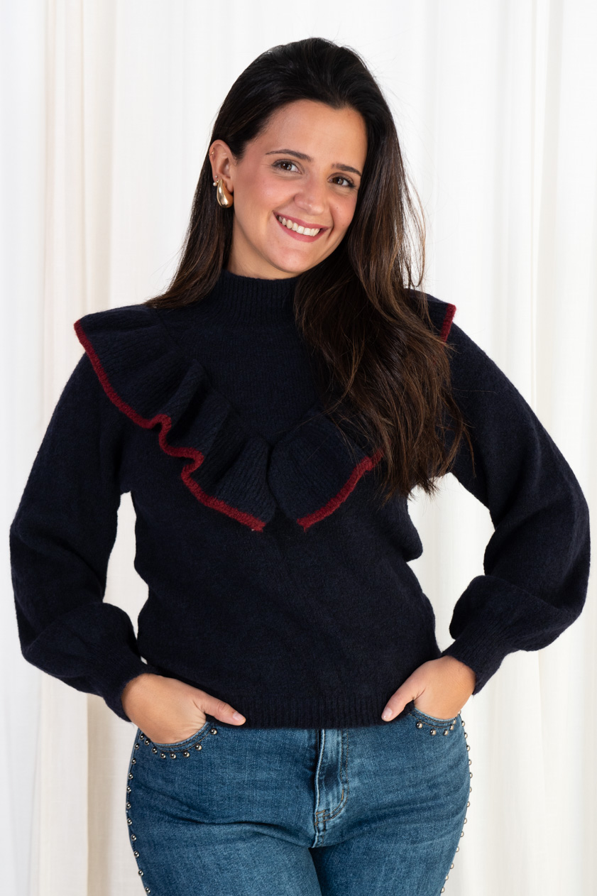 Jersey confeccionado en tejido de punto con volantes en la parte superior. Cuello, puños y parte inferior acanalado. Talla única, sirve para S, M y L. Composición: 68% acrílico, 12% poliéster, 10% nylon, 7% lana, 3% spandex.