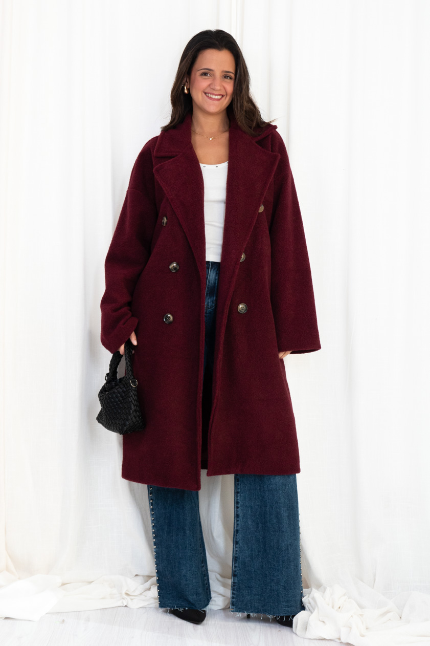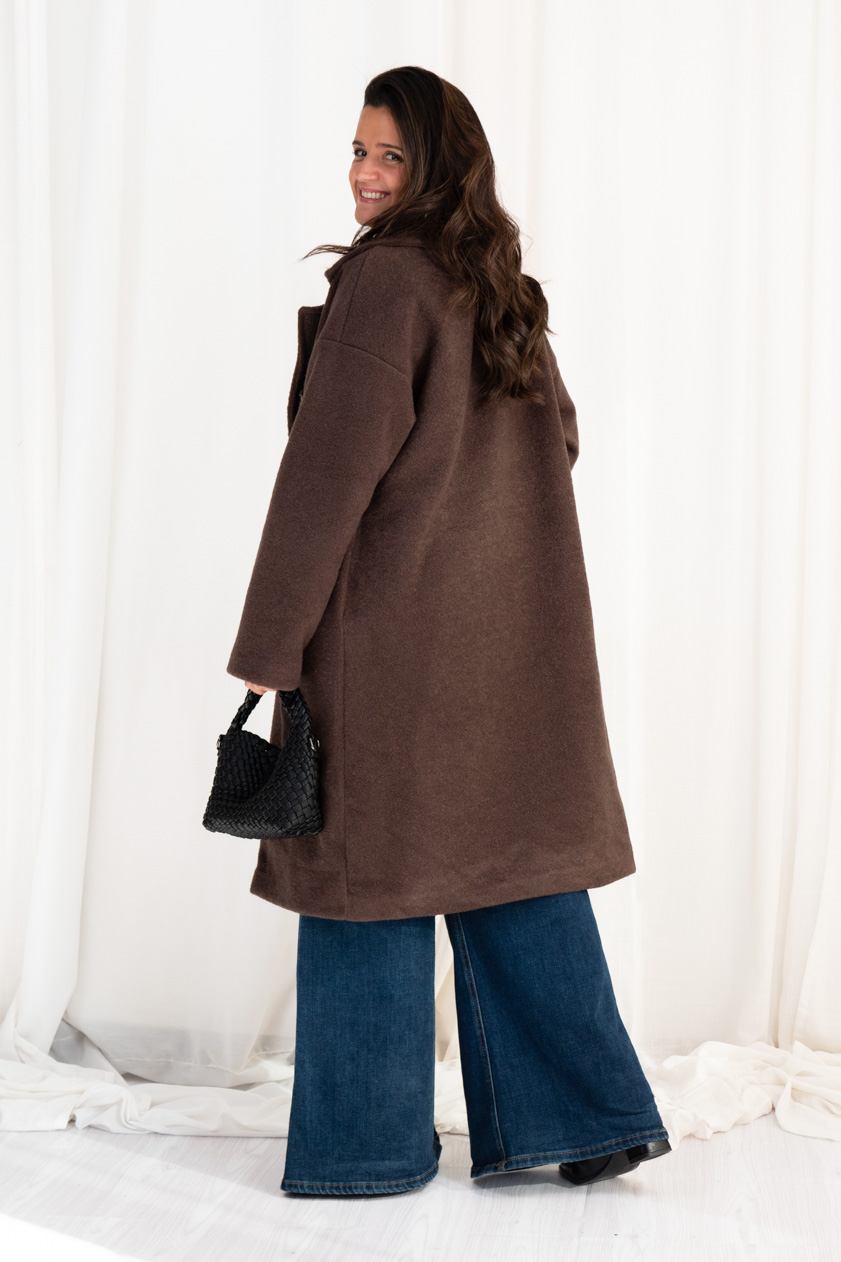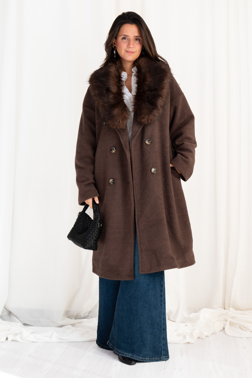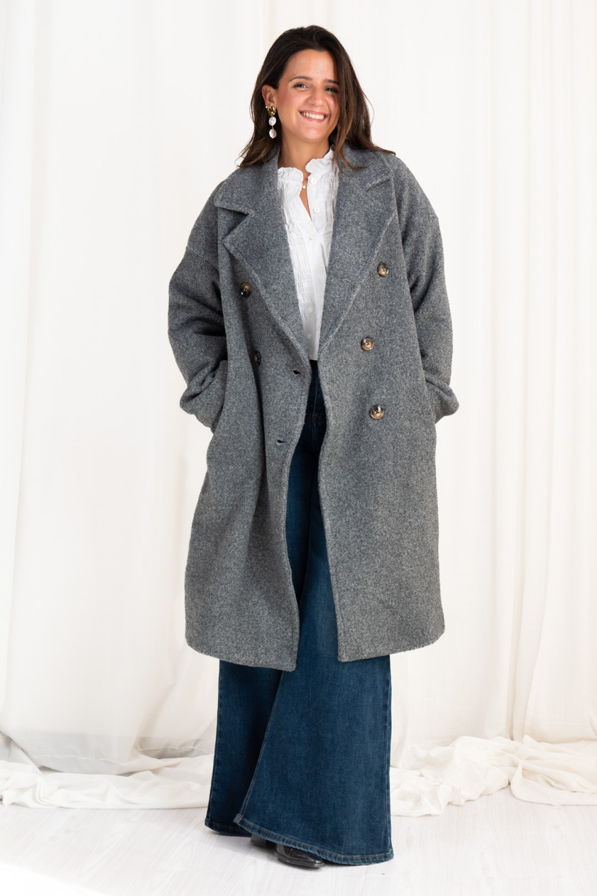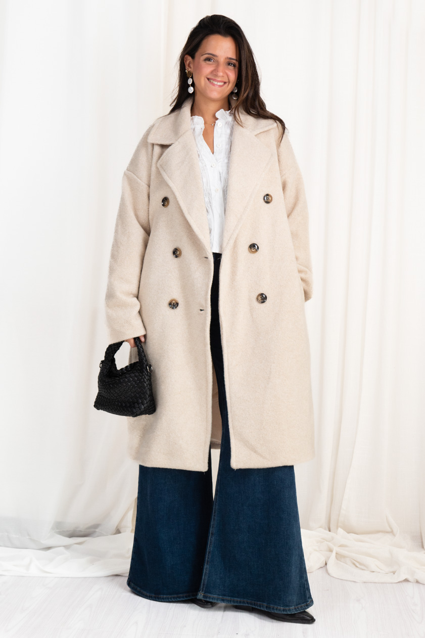 Abrigo largo confeccionado en un tejido suave tipo lana. Diseño de corte recto y silueta oversize permite combinarlo fácilmente con distintos estilos, desde outfits casuales hasta más formales. Cuenta con solapas anchas, doble botonadura frontal y bolsillos laterales funcionales. Combina con nuestro cuello de pelo sintético, que se vende aparte. Talla única, sirve para xs/s/m/l. Composición: 100% poliester.