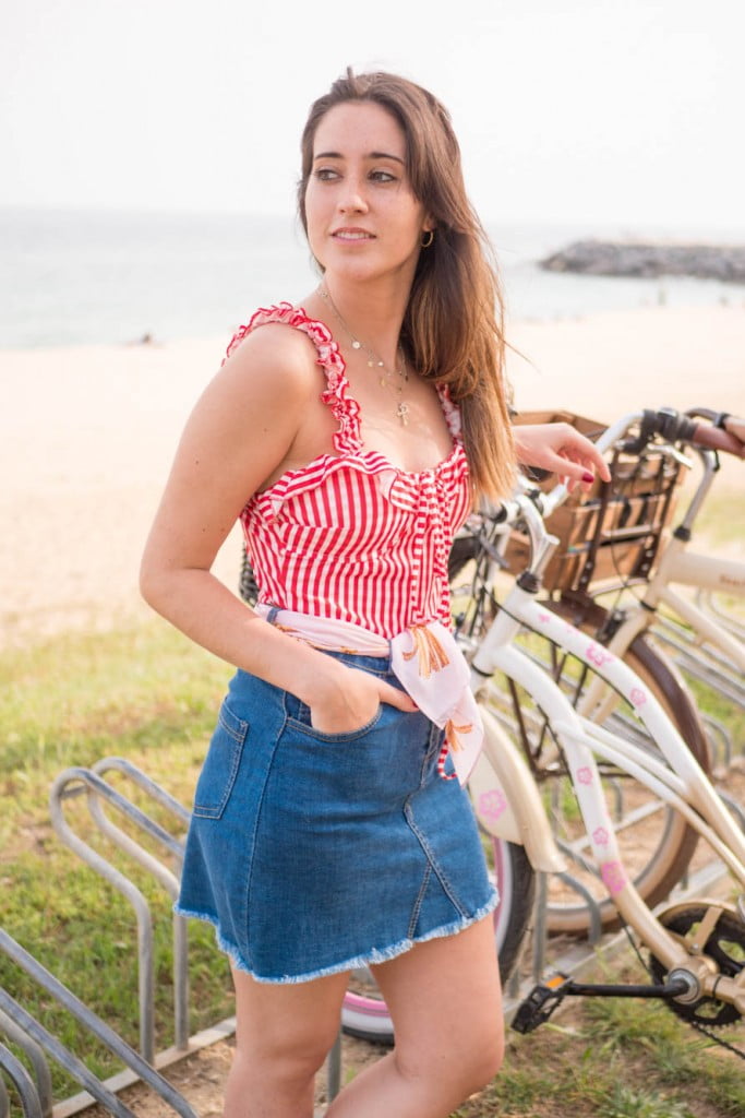Los tops de tirantes con volantes también encajan a la perfección en la moda pin up mujer, y combinados con una falda tejana quedan a las mil maravillas.