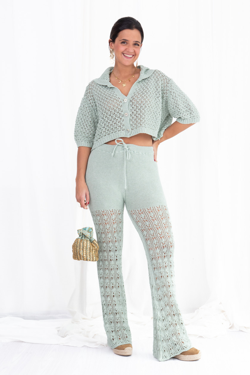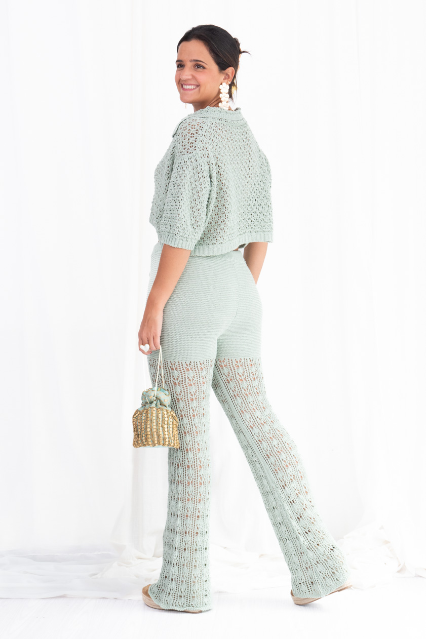 Pantalón largo de corte acampanado, confeccionado en tejido de crochet calado, con goma en la cintura y ajustable con un lazo. Talla única, sirve para xs/s/m. Composición: 50% algodón, 50% acrílico.