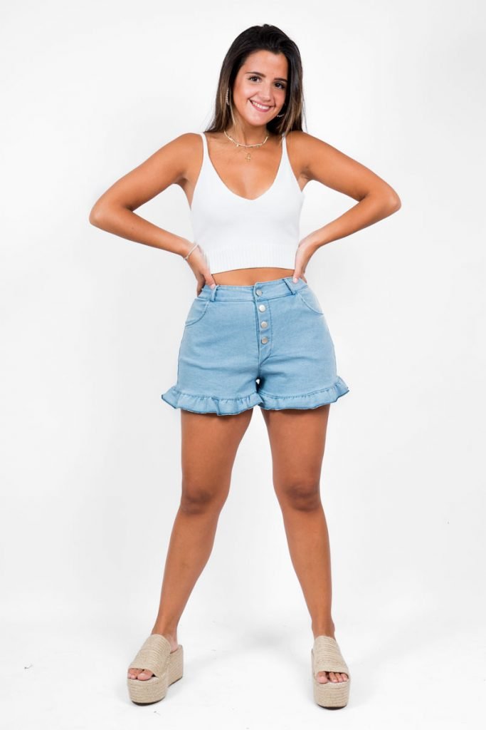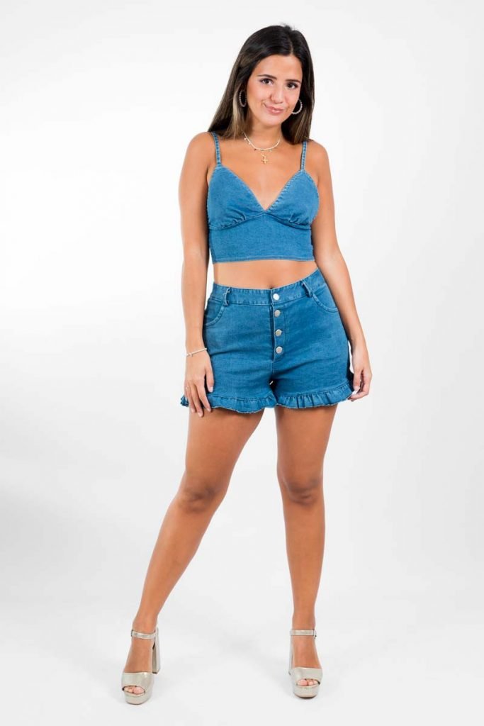 A veces es un poco complicado encontrar pantalones vaqueros cortos mujer que nos gusten. Demasiado largos, demasiado cortos, aburridos… Nosotras te proponemos unos pantalones cortos vaqueros mujer en dos colores de tejano, uno más claro y otro más oscuro. Además, en la parte de abajo lleva unos pequeños volantes que le dan un toque especial.