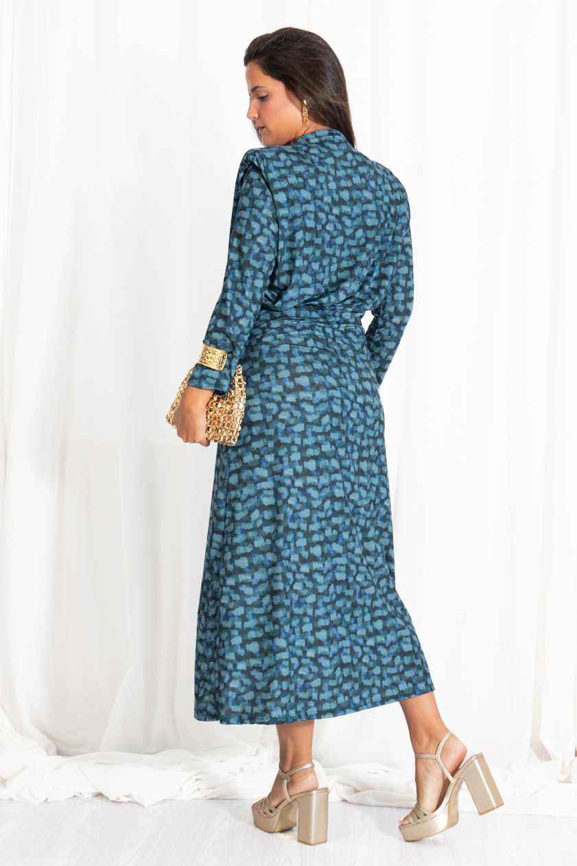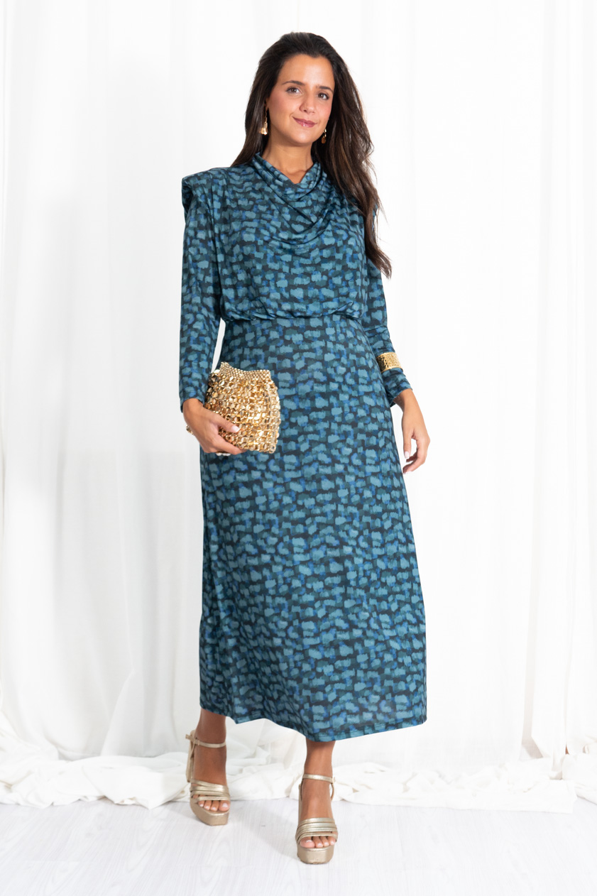 Vestido confeccionado en tejido elástico estampado, con escote cerrado drapeado y manga larga. Queda ceñido a la cintura con una goma y es de corte midi. Talla s: 34/36 talla m: 38/40. Composición: 100% poliéster.
