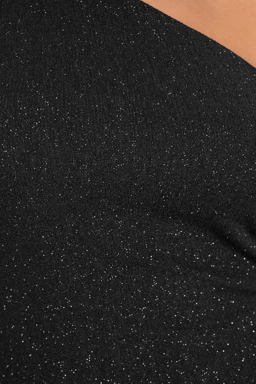 Vestido largo de lurex en tejido elástico y de corte asimétrico, con manga larga cubriendo el brazo derecho y hombro izquierdo al descubierto. Lleva abertura lateral. Composición: 95% viscosa, 5% elastan.