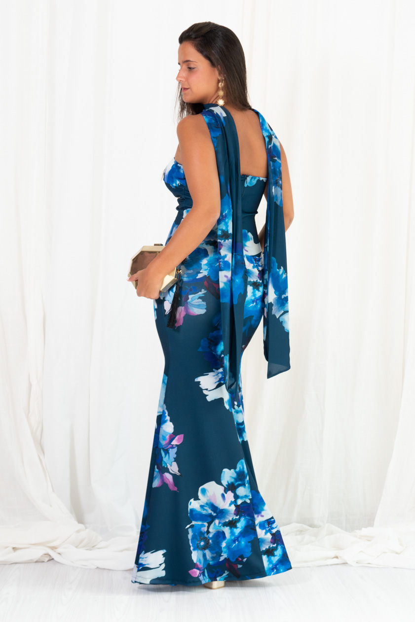 Vestido largo confeccionado en tejido de crepe elástico con estampado de flores, con escote palabra de honor con copas en el pecho. Lleva cremallera invisible en la espalda y tiene corte tipo sirena. Incluye un foulard a juego para el cuello. Talla única, sirve para s/m/l. Composición: 95% poliéster, 5% elastan.