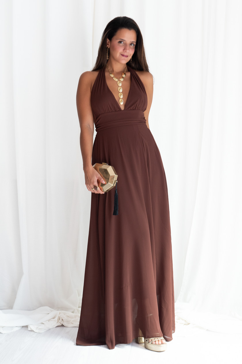 Vestido largo confeccionado en tejido de gasa con forro, con escote en forma de V y tirantes atados al cuello. Se ajusta a la cintura con un lazo y lleva goma. Tiene una abertura en la parte delantera. Talla única, sirve para xs/s/m/l. Composición: 97% poliéster, 3% elastan.